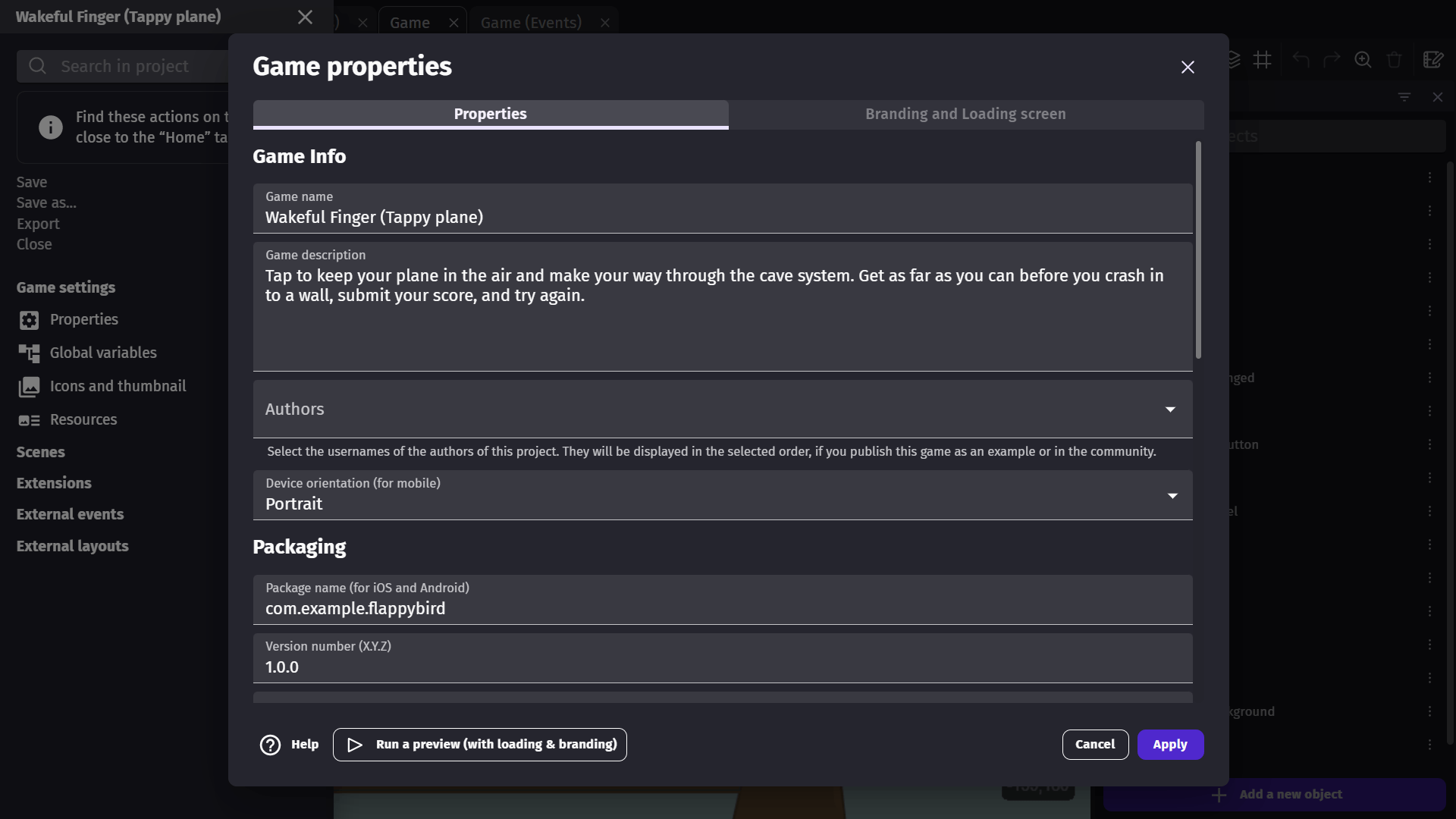 • Game description: The description for your game that will be used if you upload to GDevelop's game hosting platform, gd.games.
