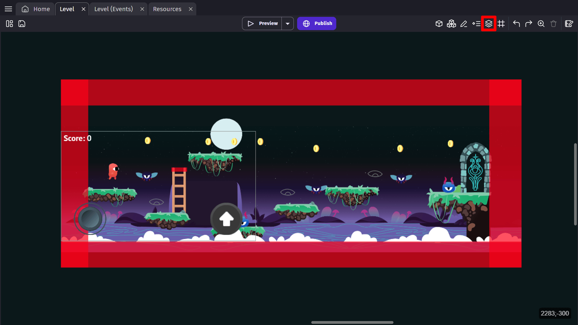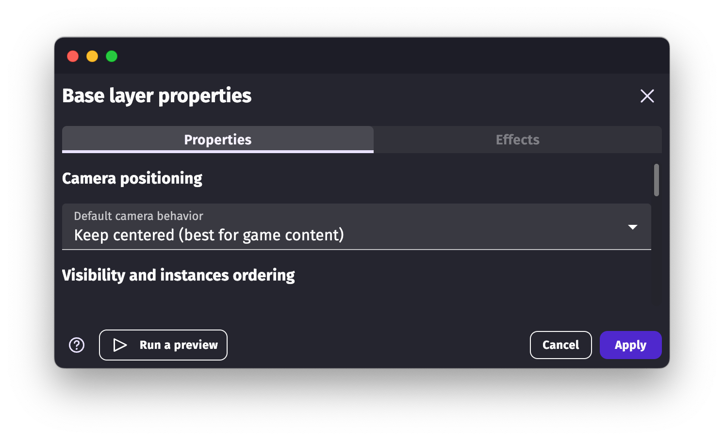 • The camera of the layer stays centered when the game window is resized. This is usually useful for game content or menus