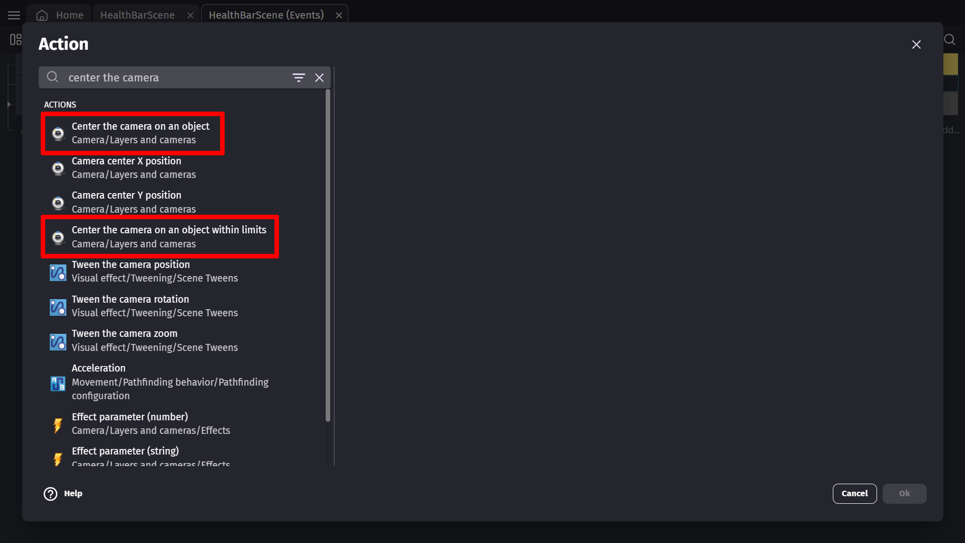 • To prevent the camera from going out of bounds, you can use the action Center the camera on an object within limits. This will let the camera follow the object while preventing the center of the camera from leaving the boundaries described in the action.